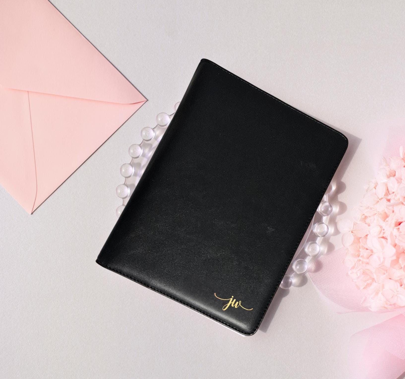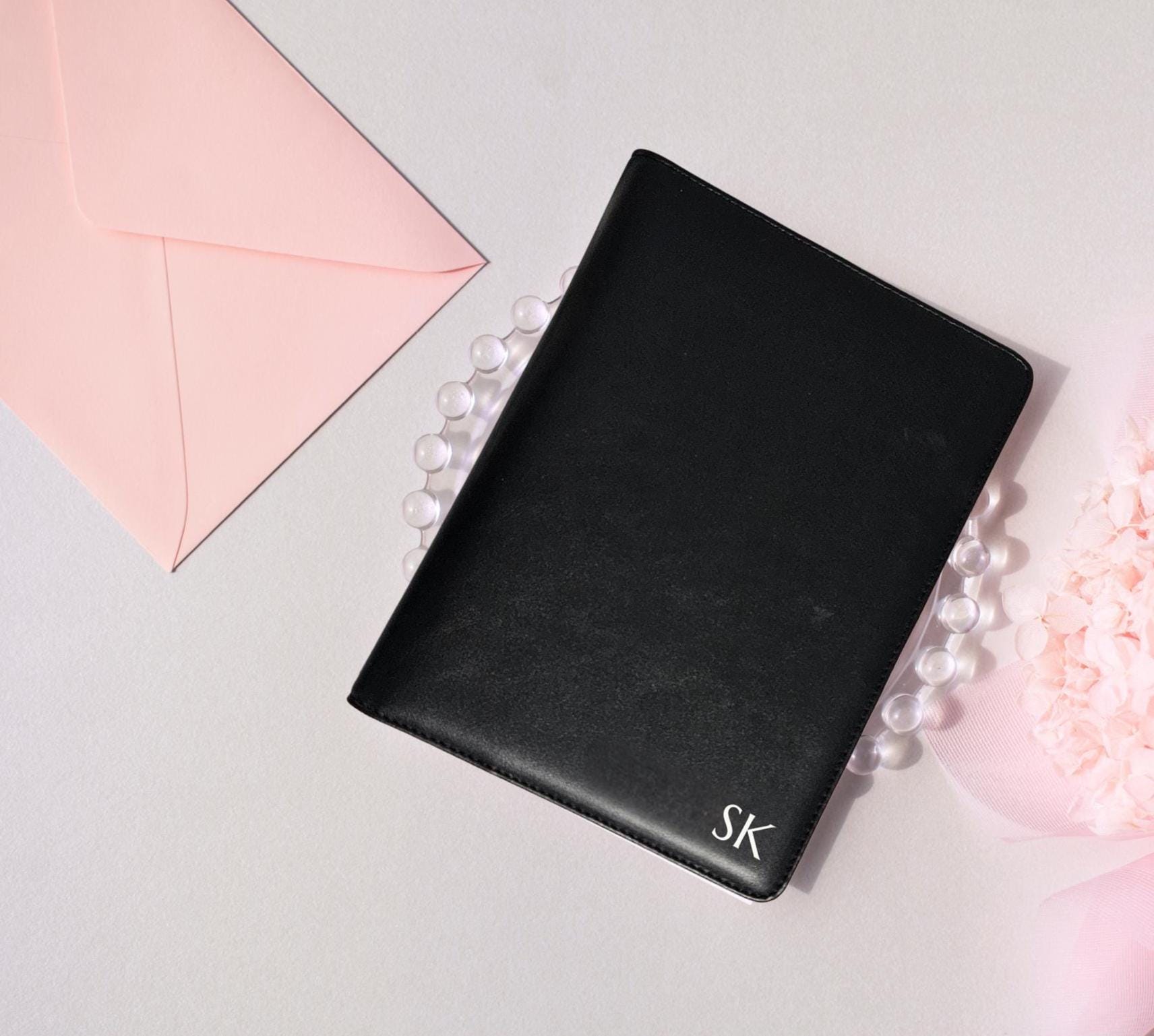 Optional Add-On: Personalized Black Leatherette Padfolio Upgrade your notepad with a sleek, professional padfolio—perfect for taking notes on the go or keeping your paperwork organized in style. This 9" x 7" padded black leatherette padfolio is designed to perfectly hold your 5.5" x 8.5" notepads. It features interior pockets for documents, a built-in card holder, and a secure notepad slot—ideal for clinical rounds, client sessions, or meetings. Make it truly yours with your initials heat-embossed in elegant gold foil on the front cover.