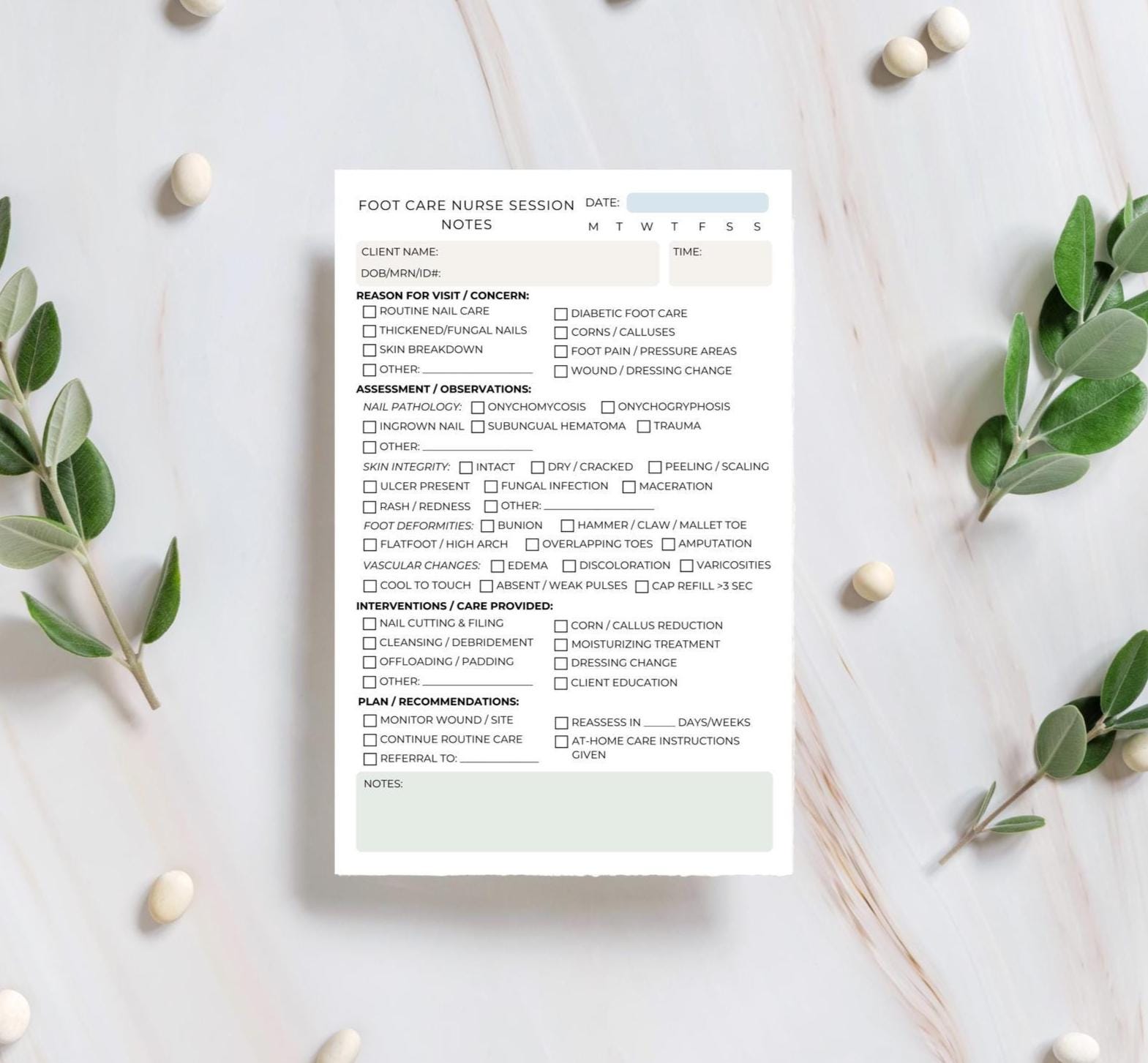 - Includes checkboxes for: - Reason for Visit - Nail Pathology (e.g. Onychomycosis, Ingrown) - Skin Integrity (e.g. Ulcers, Cracks, Fungal) - Vascular & Structural Observations - Interventions Provided - Follow-Up/Referrals -