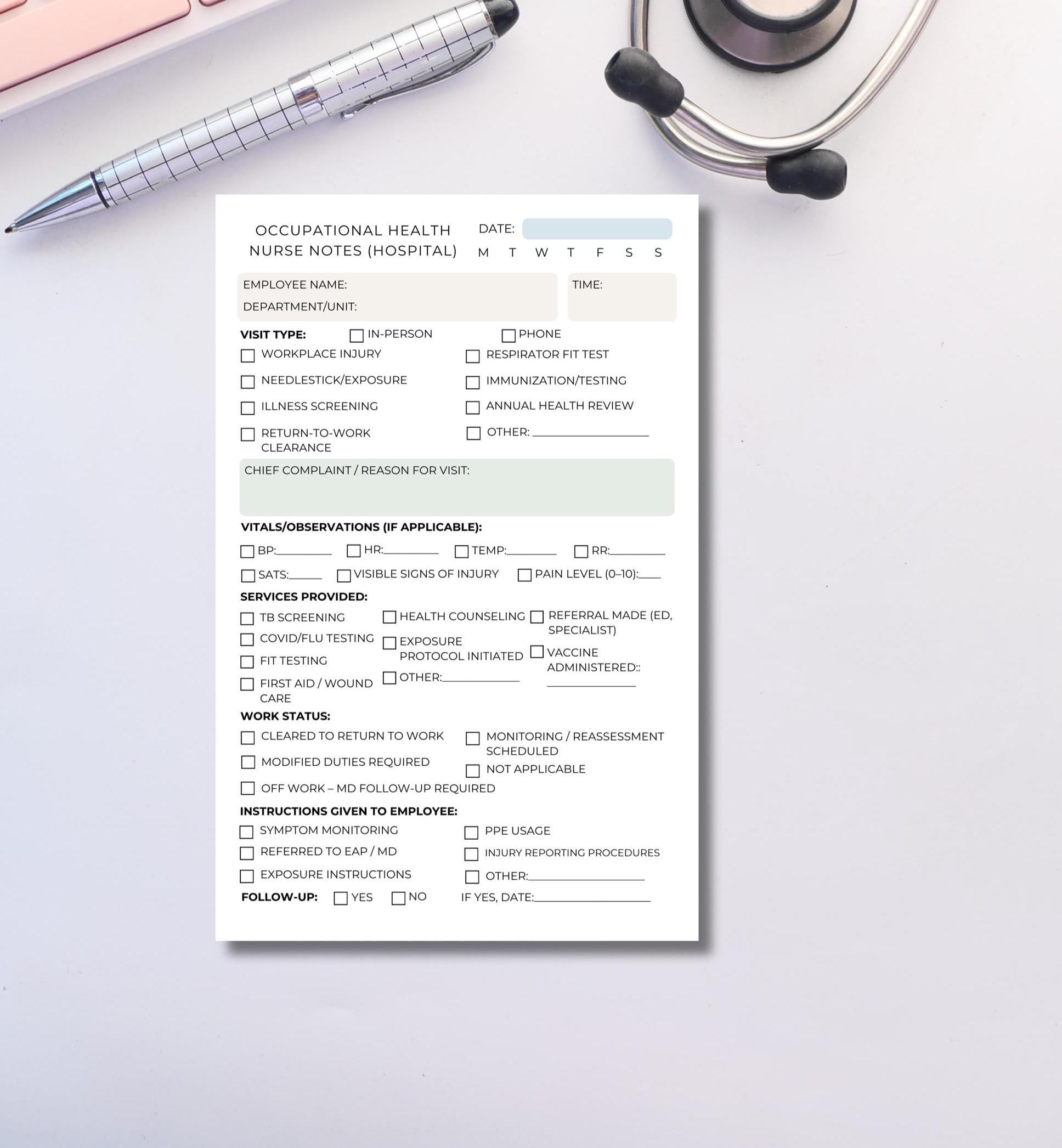 Hospital Occupational Health Nurse Session Notepad | Employee Visit Log | OHN Paperwork | Workplace Injury Notes | RN Notepad OHN clinical