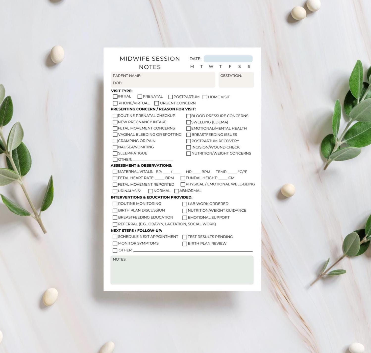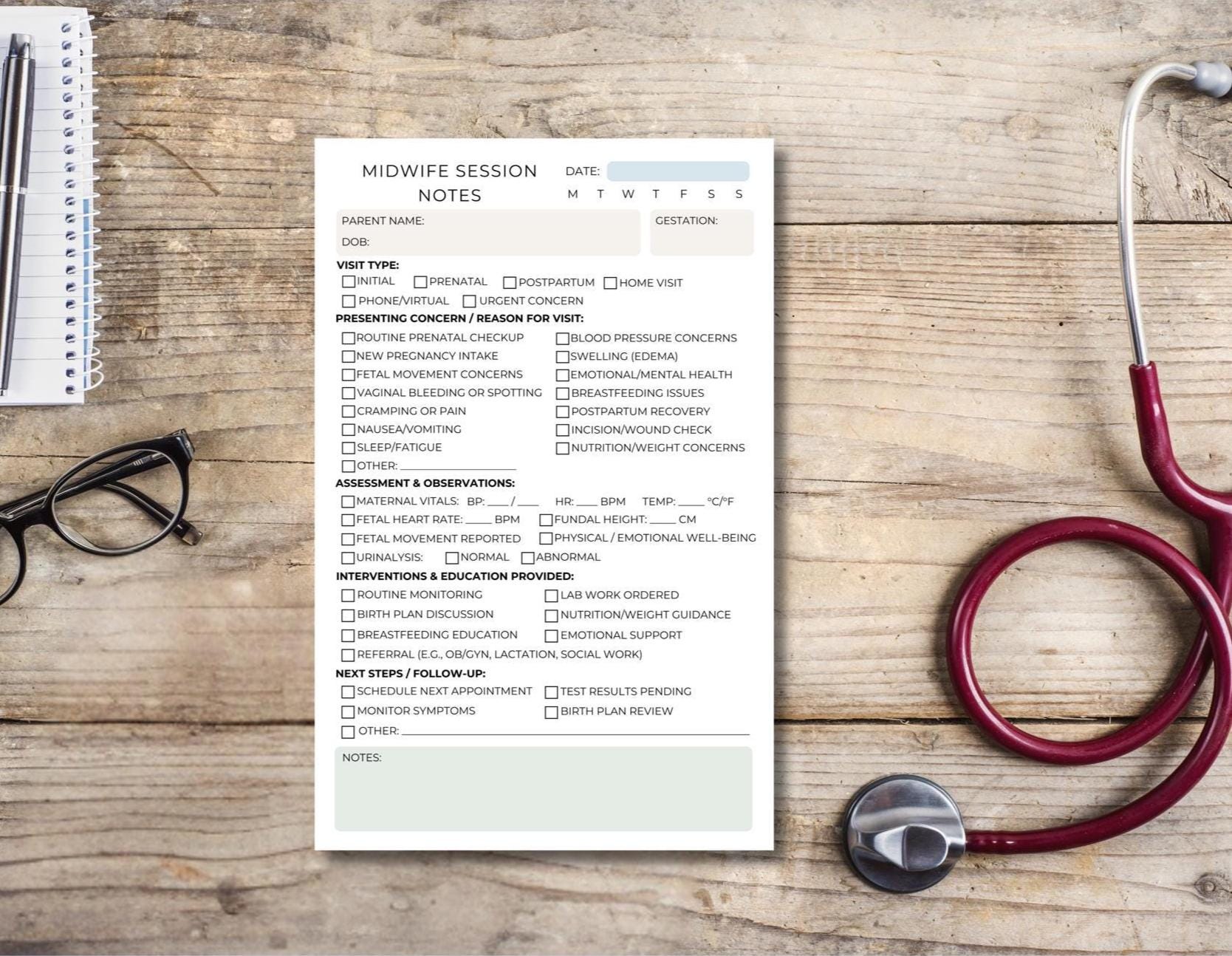 Whether you're on-the-go for home visits or working in a birth center, this compact and intuitive notepad keeps your documentation clear and compliant — while honoring the heart-centered care midwives provide.