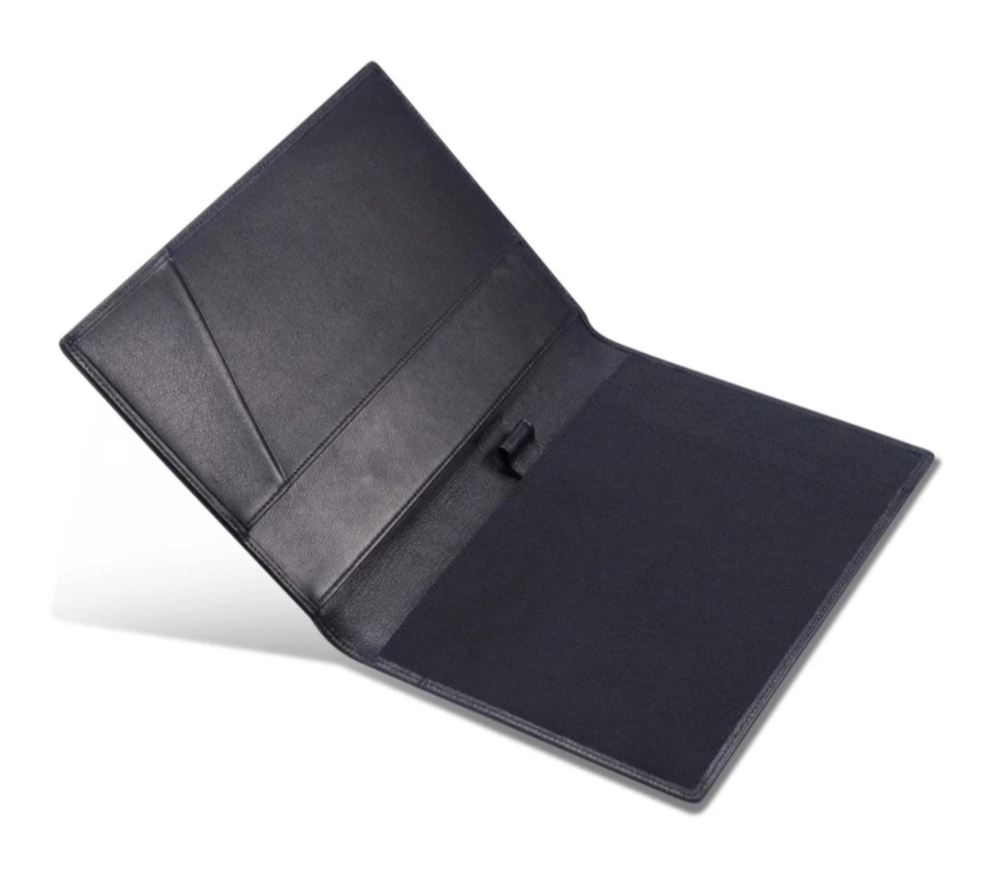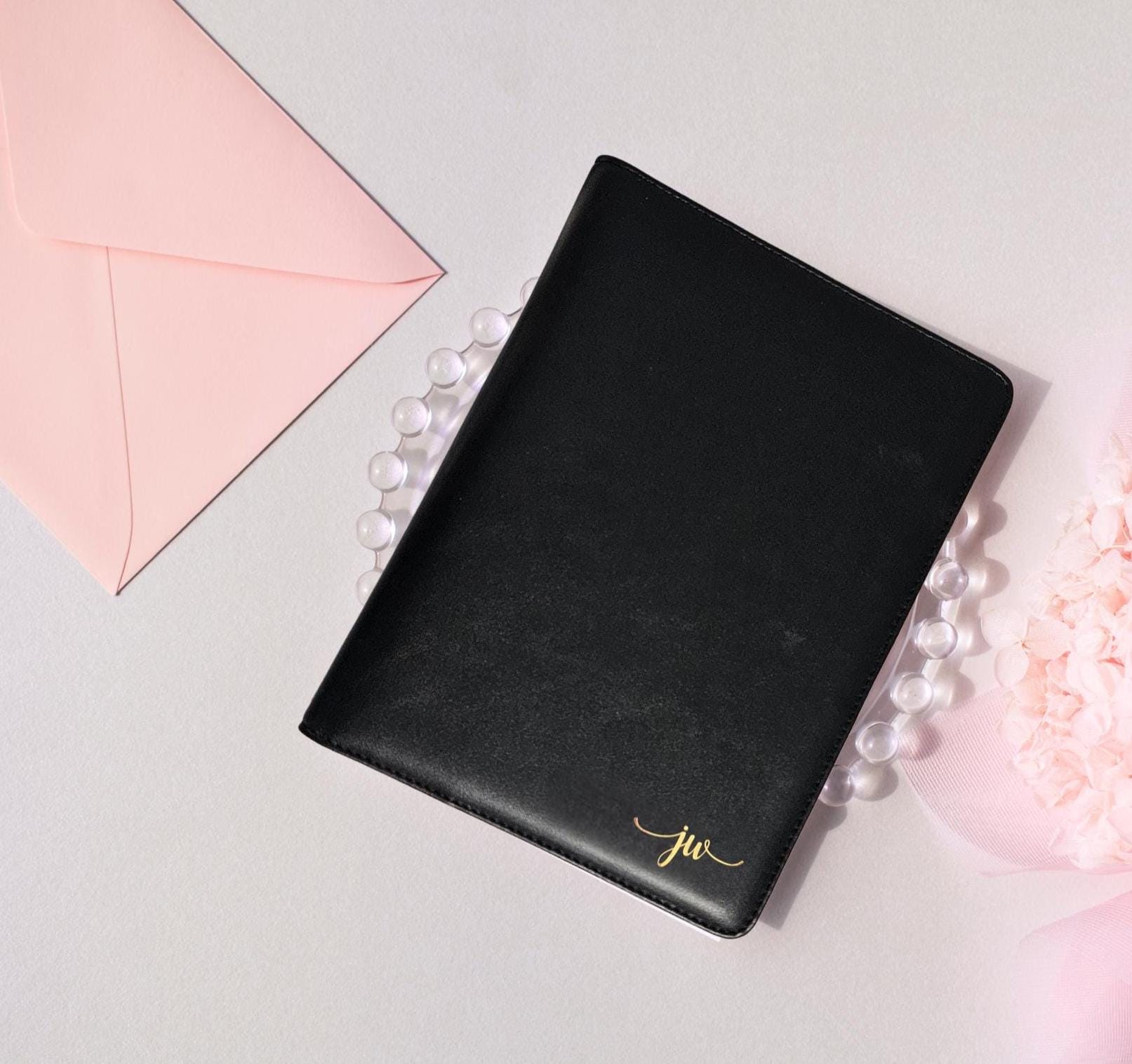 Upgrade your notepad with a sleek, professional padfolio—perfect for taking notes on the go or keeping your paperwork organized in style. This 9" x 7" padded black leatherette padfolio is designed to perfectly hold your 5.5" x 8.5" notepads. It features interior pockets for documents, a built-in card holder, and a secure notepad slot—ideal for clinical rounds, client sessions, or meetings. Make it truly yours with your initials embossed in elegant heat-embossed gold foil on the front cover.