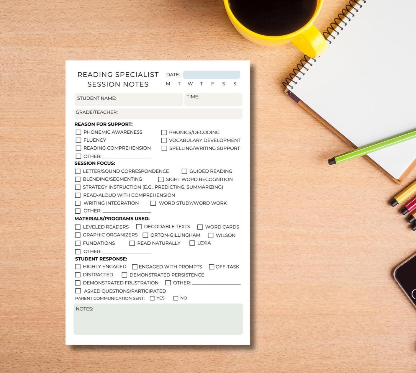 Reading Specialist Session Notes Notepad | Literacy Support Log for Educators | RTI Documentation | Teacher Supplies | Intervention Record