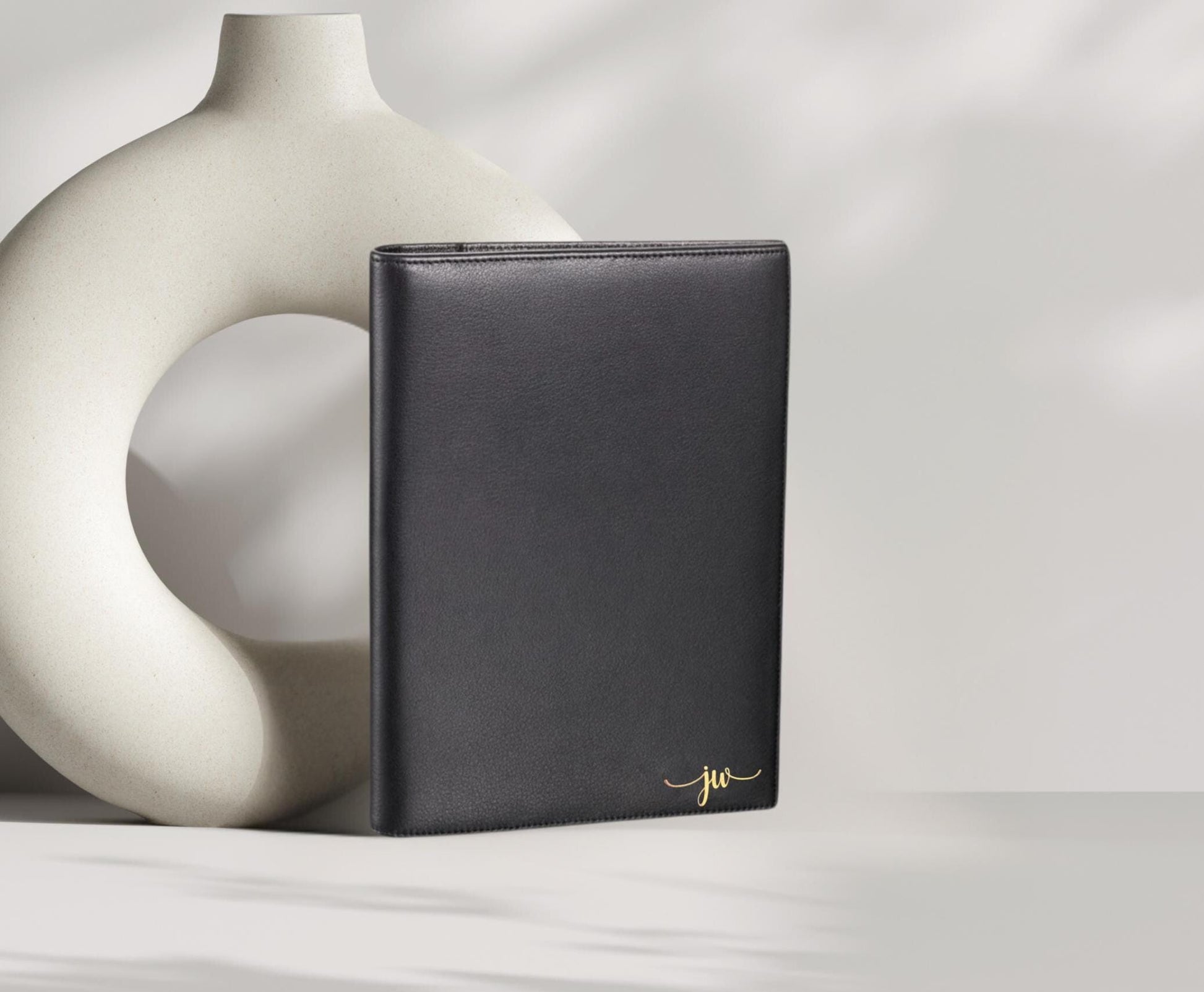 Upgrade your notepad with a sleek, professional padfolio—perfect for taking notes on the go or keeping your paperwork organized in style. This 9" x 7" padded black leatherette padfolio is designed to perfectly hold your 5.5" x 8.5" notepads. It features interior pockets for documents, a built-in card holder, and a secure notepad slot—ideal for clinical rounds, client sessions, or meetings. Make it truly yours with your initials heat-embossed in elegant gold foil on the front cover.