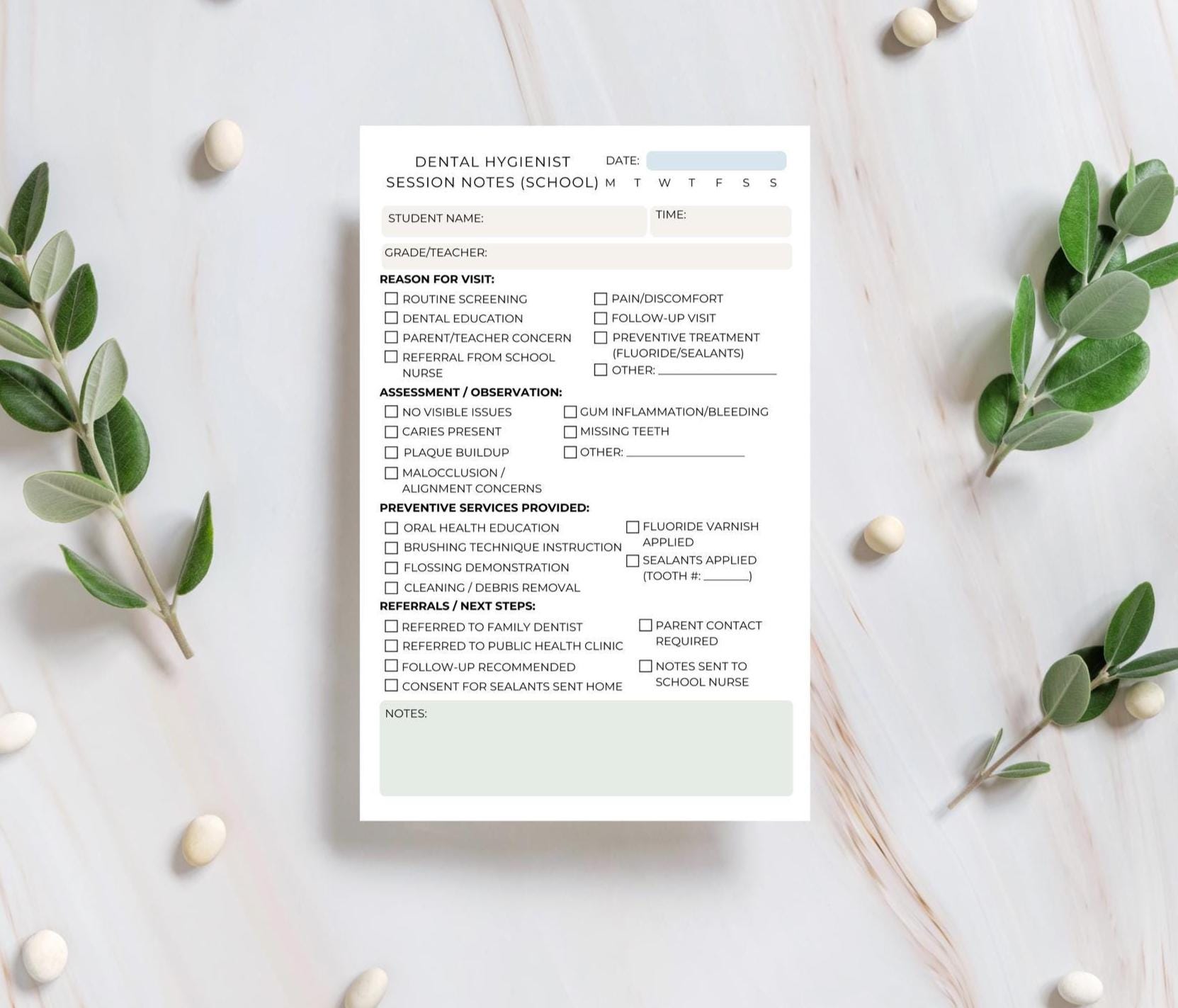 • Additional Notes Ideal for school dental hygienists, public health programs, or outreach initiatives aiming to keep accurate and efficient documentation during student visits.